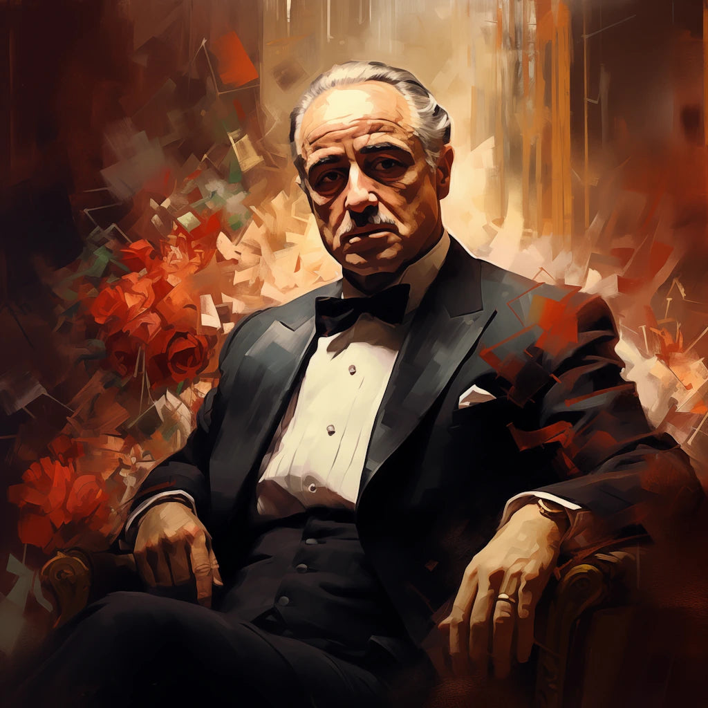 The Good Old Days masterfully captures the complex essence of Vito Corleone, the iconic godfather from the seminal film 'The Godfather.' Through the lens of impressionism with a dash of abstraction, the duality of a character revered and feared is explored, enveloping him in an aura of authority and enigmatic charm. The painting, characterized by its fine-grained and coarse brushstrokes, creates a texture that mirrors the multifaceted nature of Corleone himself. Dressed in a sharp black tuxedo, his expression — a blend of innocence and the weight of unspoken deeds — draws the viewer into a silent contemplation of the man behind the myth. The presence of red roses by his side, vibrant against the somber tones of his attire, serves as a poignant metaphor for the blood-stained path of power and the fragile beauty of loyalty and honor in the underworld.